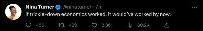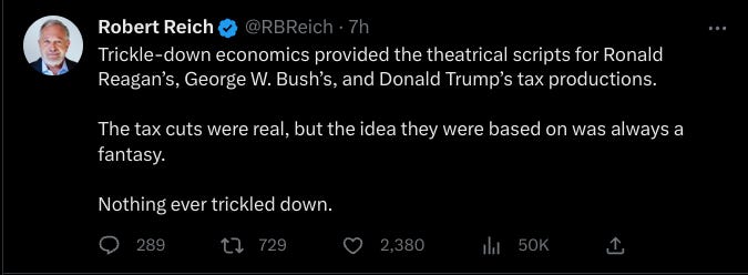 Earlier this year, I made a post discussing how trickle down economics is nothing but a made-up Leftist boogieman. I will not rehash the entire thing now, but I wanted to take the time to remind you that the Left still invokes this idea that they made up. I just saw the following two tweets, both from today: